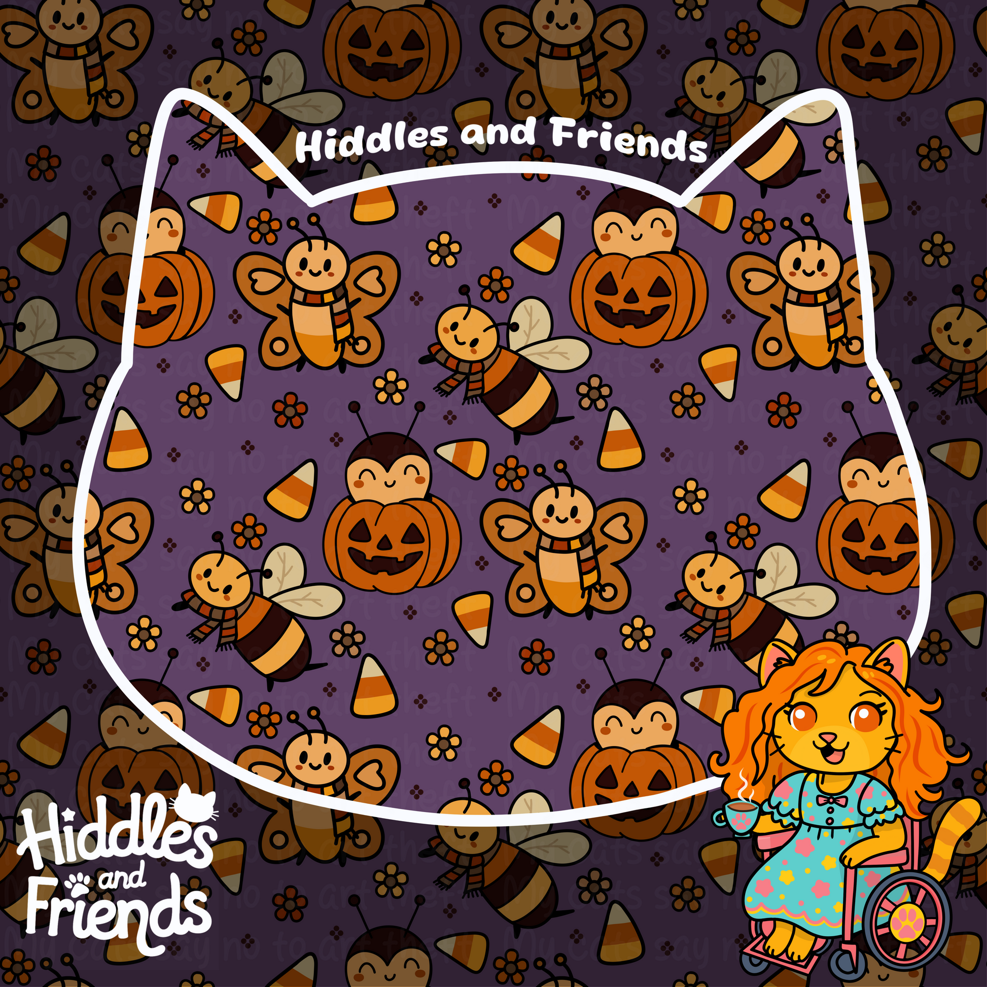 This adorable Halloween seamless pattern features cheerful bees and ladybugs with scarves, jack-o’-lantern pumpkins, and candy corn surrounded by tiny flowers. Perfect for fabric, stickers, sublimation, and all your cozy fall projects, this playful design brings a whimsical buzz to spooky season!