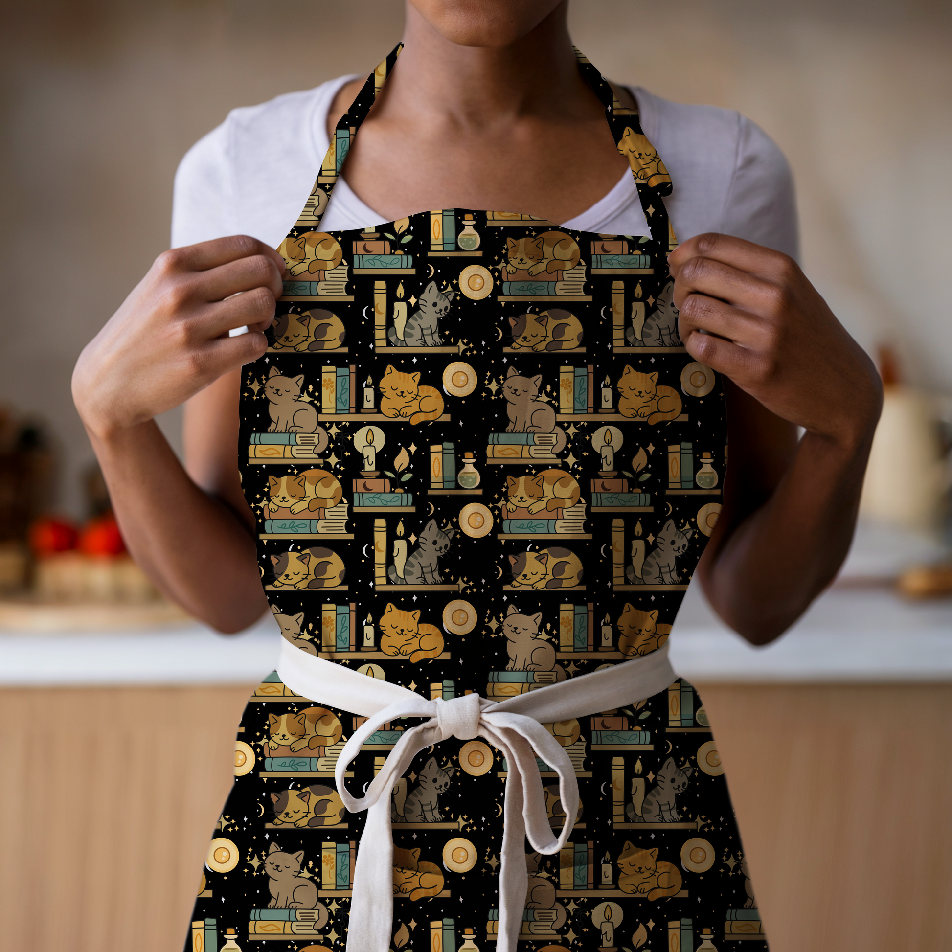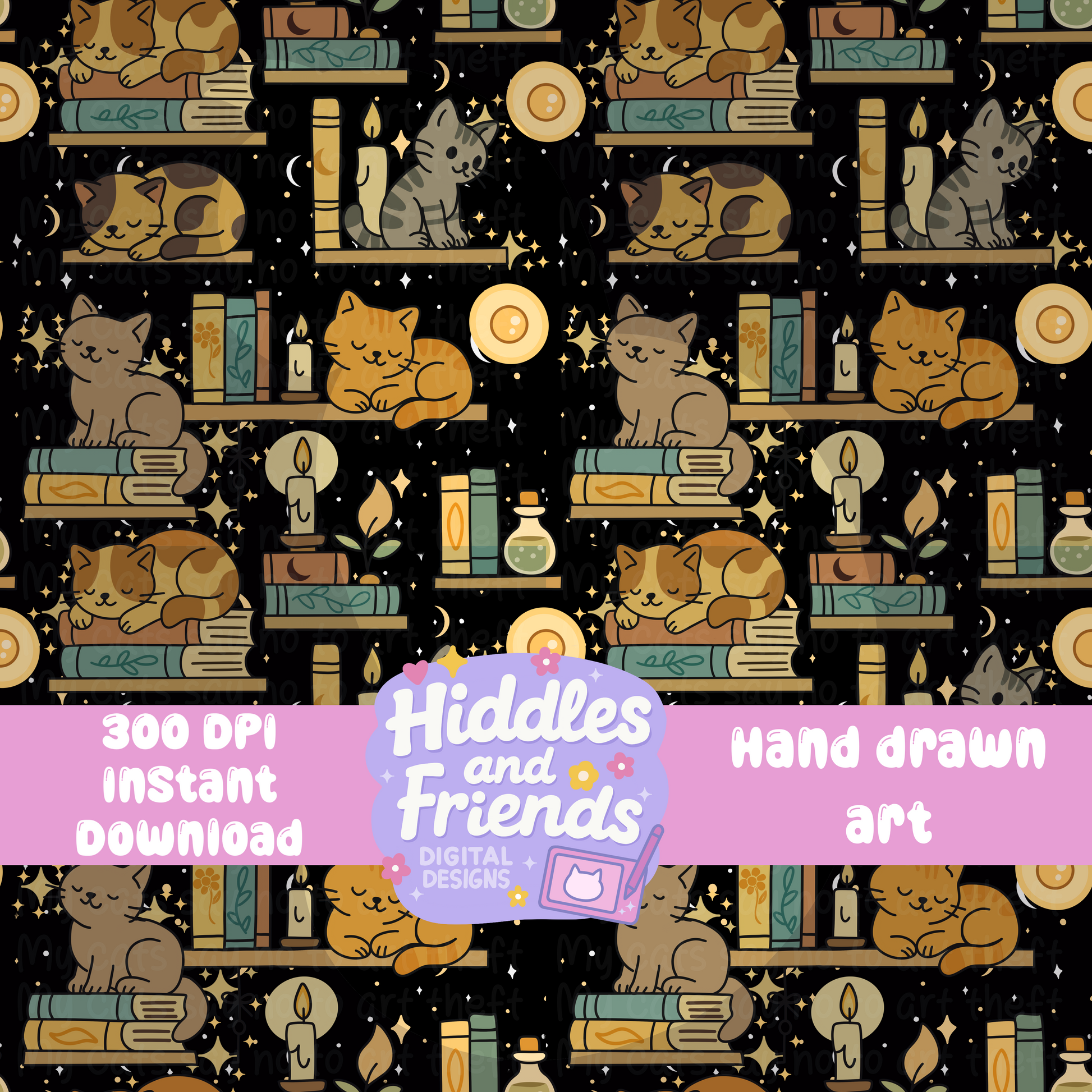 A hand drawn seamless pattern filled with cozy charm: sleepy cats, books, candles, potions, and shelves! Perfect for fabric, wrapping paper, crafts, or sublimation. This light background version adds a soft and homey touch. This darker version brings moody vibes to your projects – perfect for fabric, stationery, or digital use!