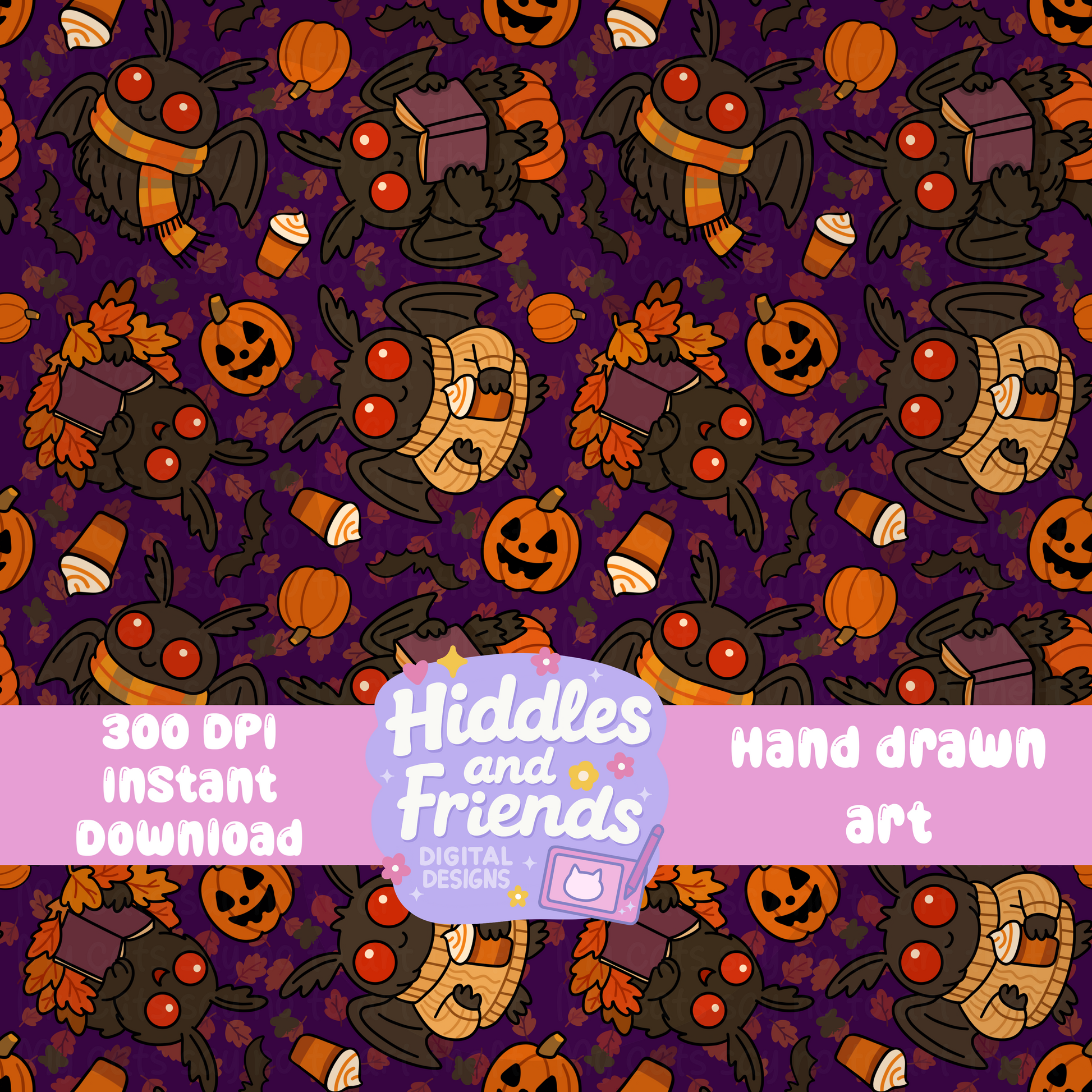 This adorable hand-drawn seamless file features a cozy Halloween Mothman surrounded by pumpkins, books, candy corn, coffee, bats, and autumn leaves. Wrapped in scarves and sweaters, he’s ready for spooky season in style.
