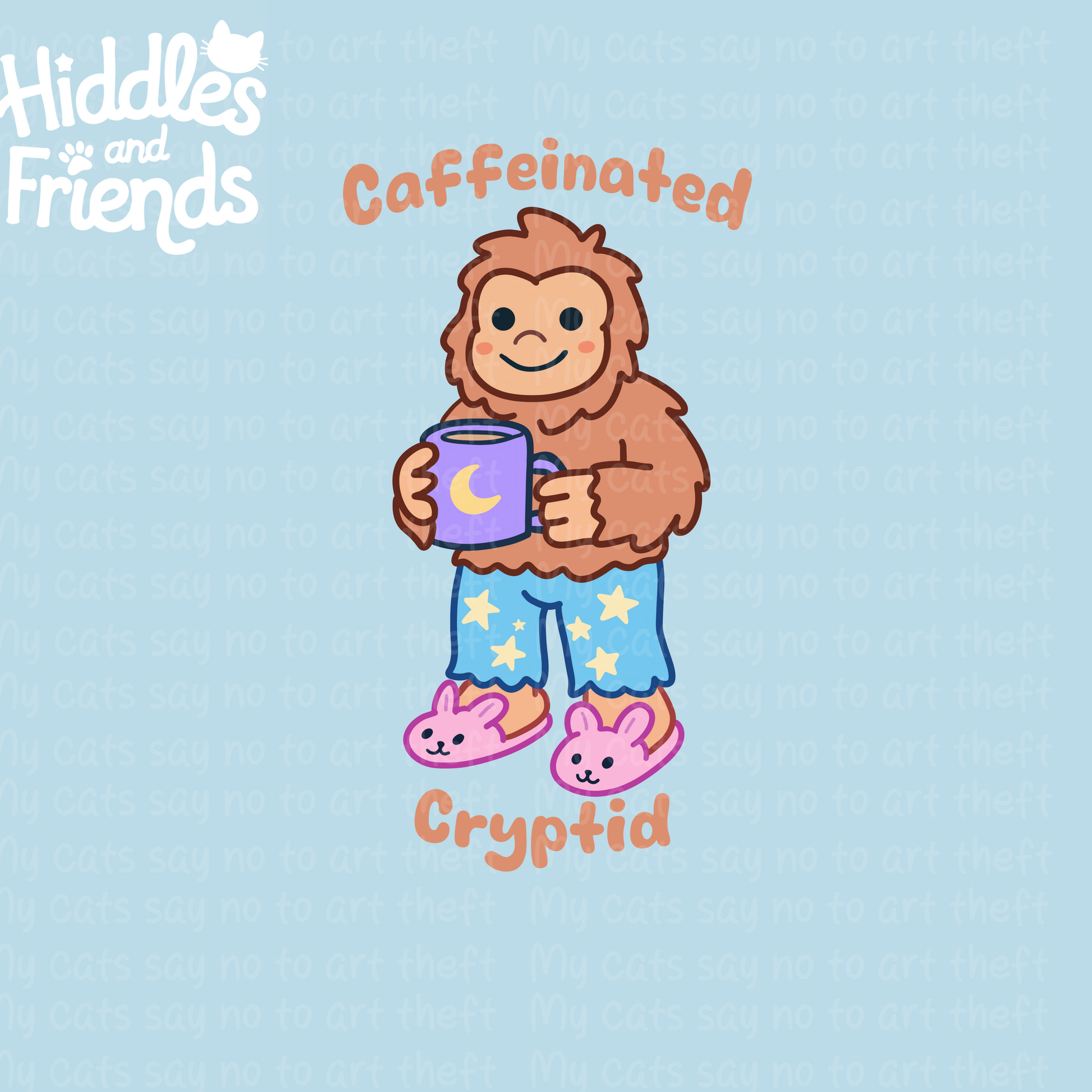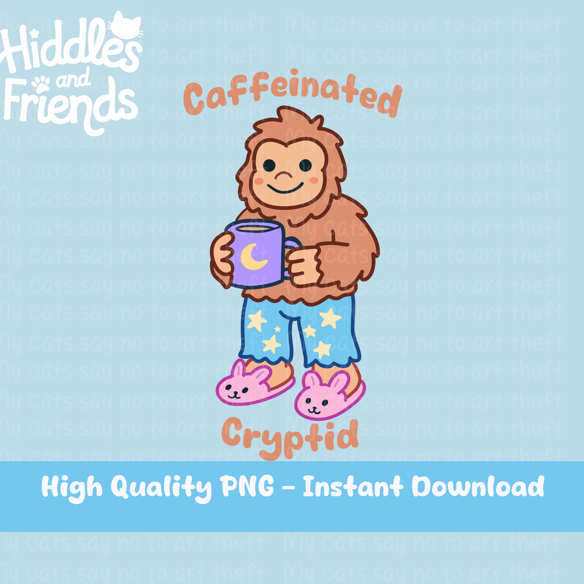 This digital sticker features a cozy Bigfoot with a hot mug and the phrase “Caffeinated Cryptid.” Perfect for digital planning, journaling, or sharing mythical energy in your daily spread. Instant download PNG file — no physical product included.