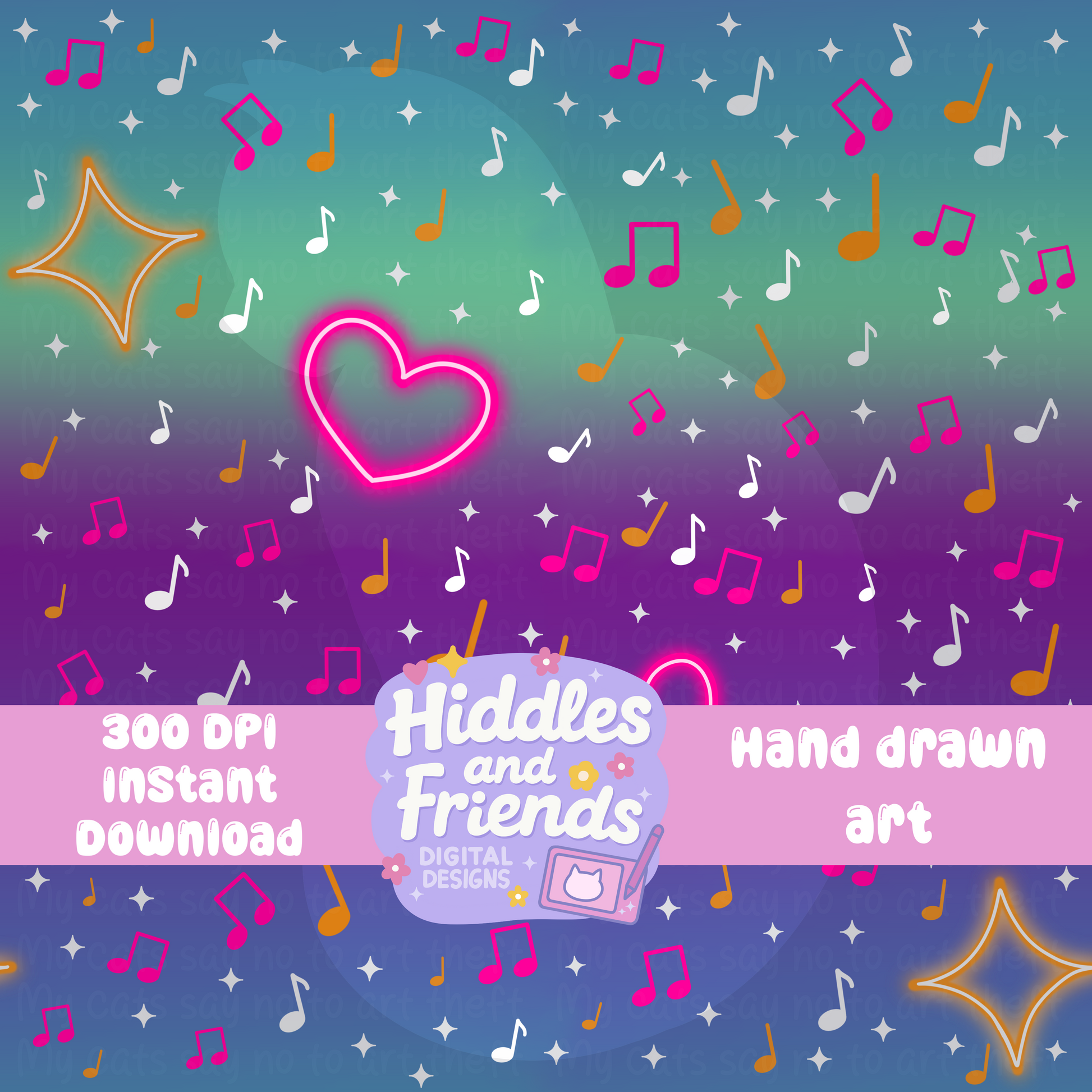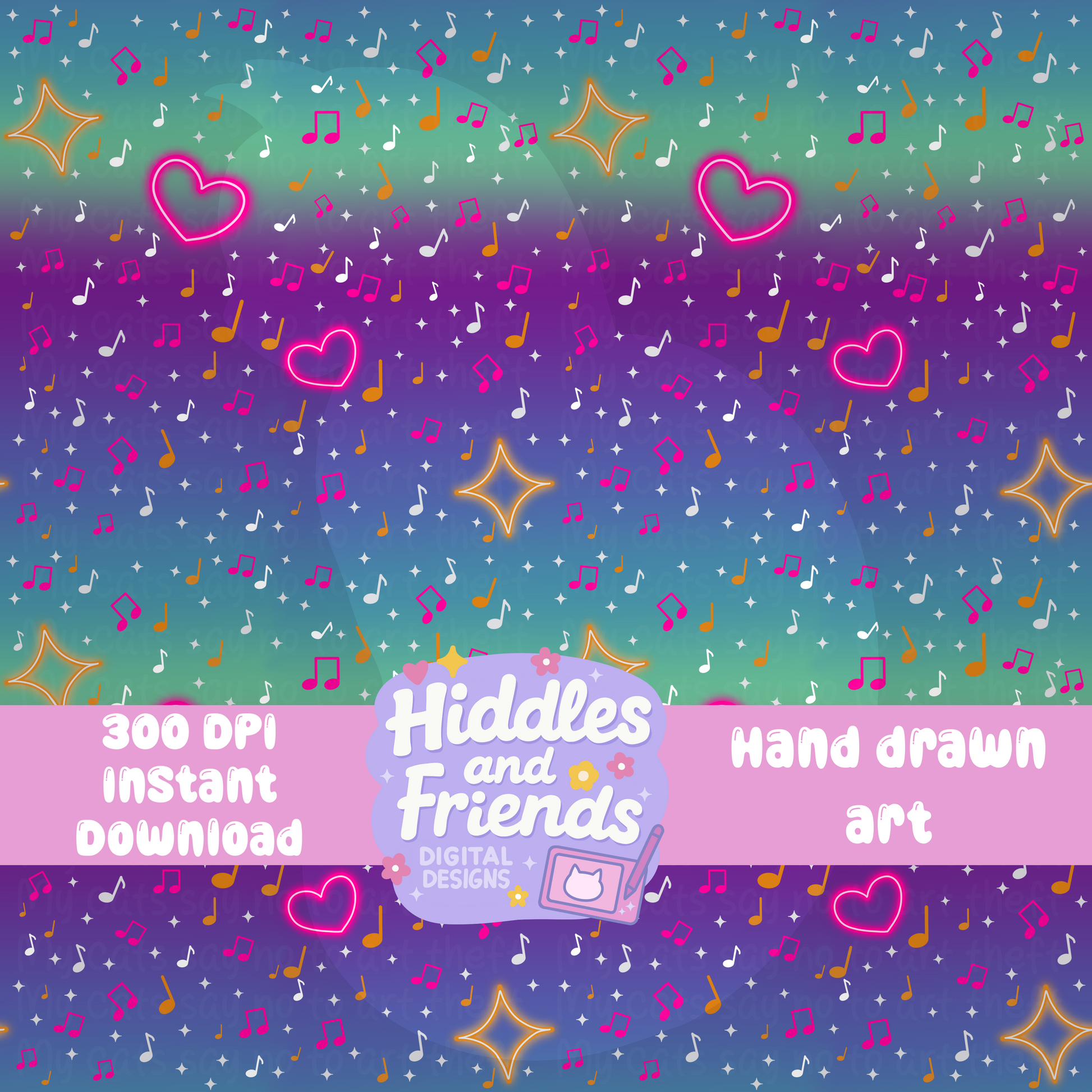 The perfect coordinating file for your pole dancing T-Rex dreams—or any party project that needs a pop of rainbow joy. This seamless background features rainbow music notes, hearts, sparkles, and neon accents over a vibrant gradient. Great for backing patterns, stickers, or standalone use!