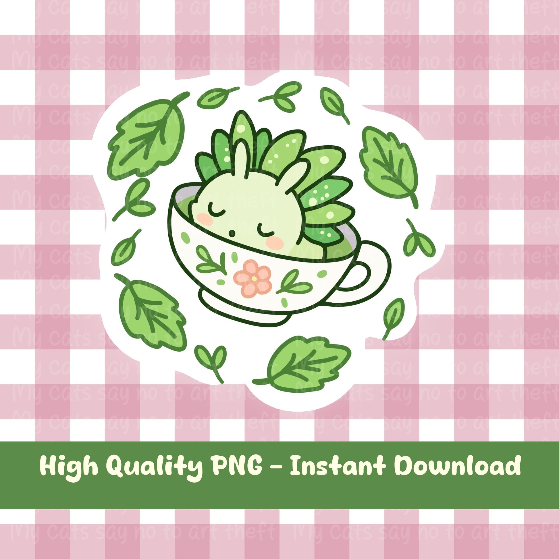Leaf Slug in Teacup Digital Sticker – Cute Kawaii Green Slug with Floral Teacup and Leaves – Instant PNG Download