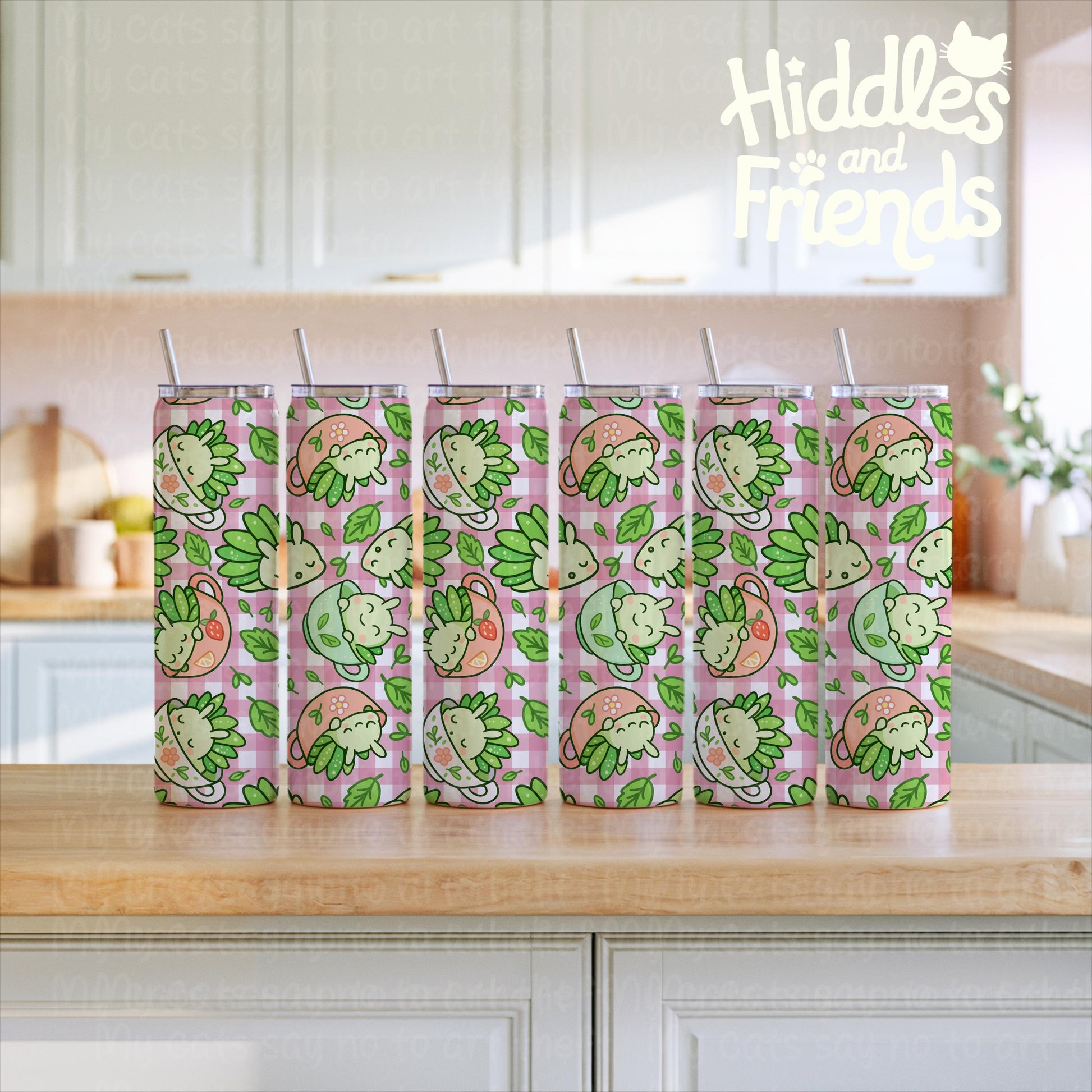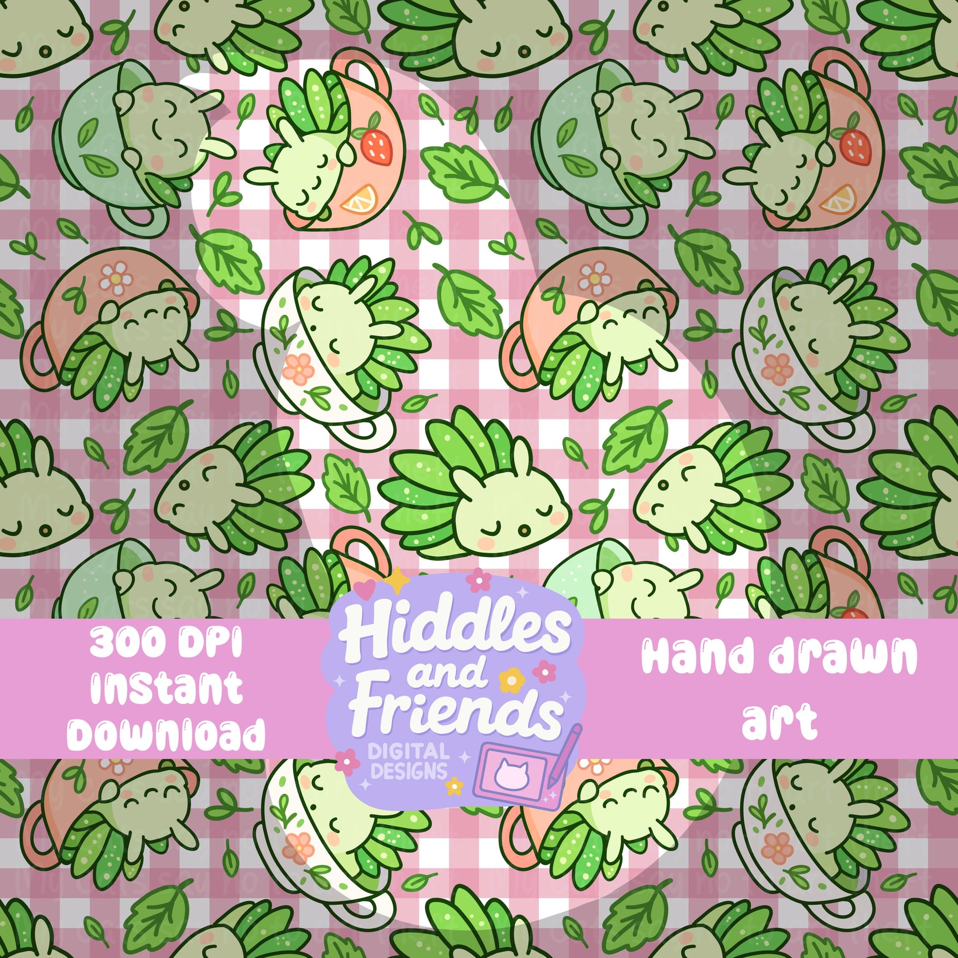 This seamless pattern features adorable leafy slugs curled up in dainty teacups with a pink gingham background and scattered leaves. Perfect for spring-themed projects, fabric printing, and digital crafting! Hand-drawn with love to bring a soft, cozy aesthetic to your creative work.