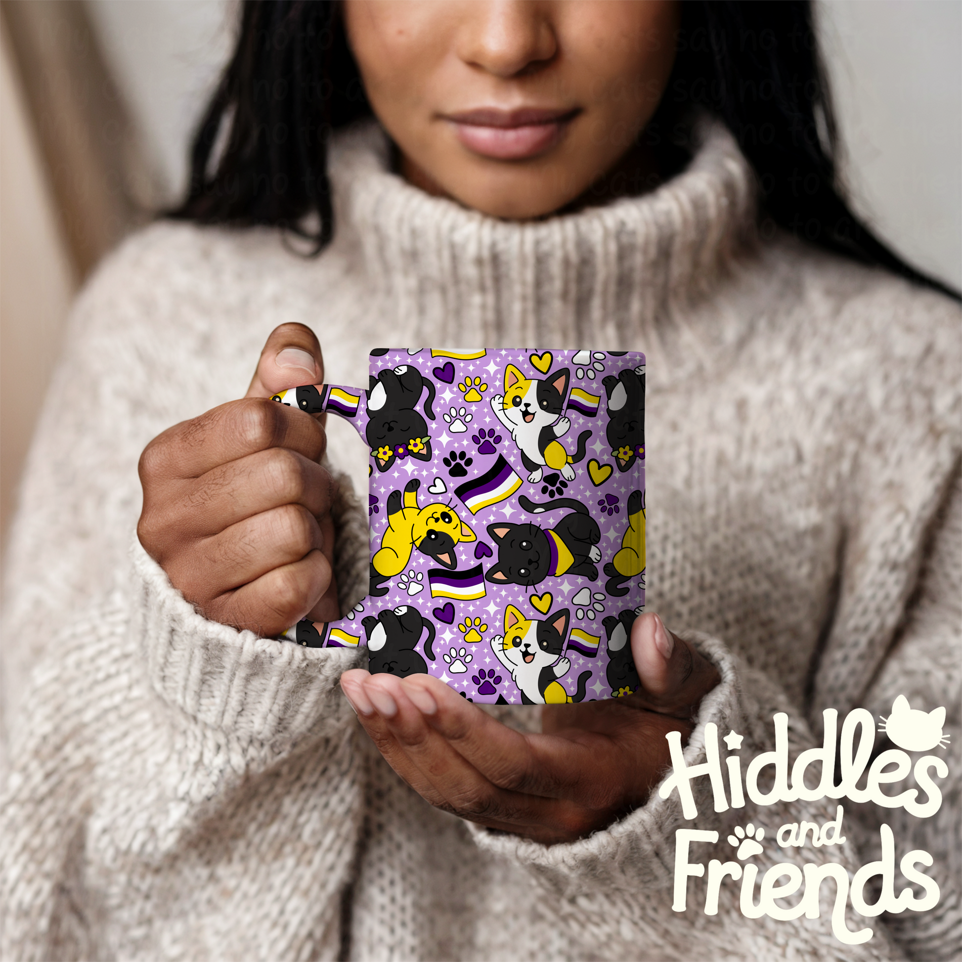 Celebrate identity and cuteness in one go with this nonbinary pride cats seamless pattern! This digital design features playful cats in black, yellow, white, and purple, proudly waving nonbinary flags and surrounded by hearts, paw prints, and sparkles. Perfect for pride merch, fabric printing, planners, or sublimation projects.