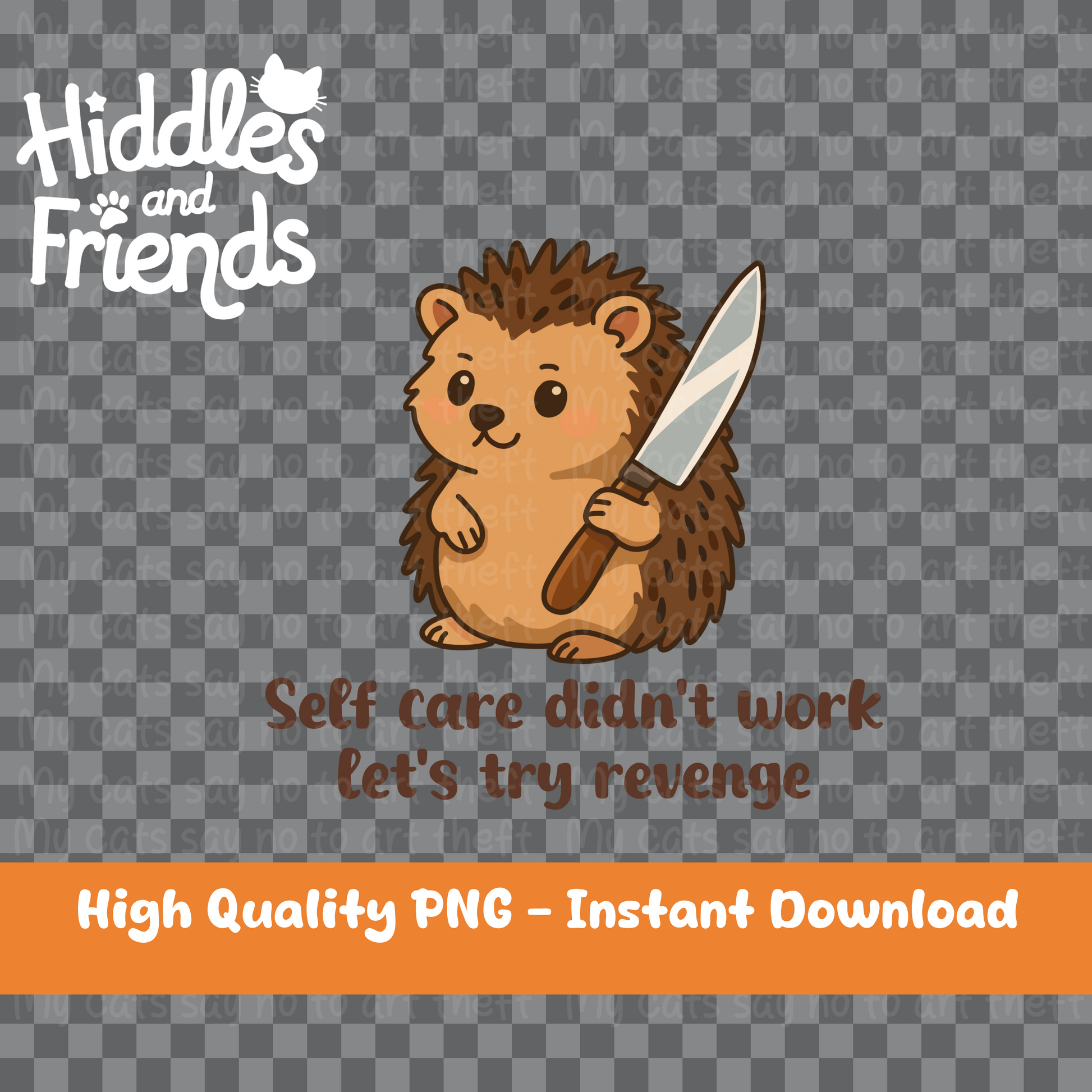 This high-quality PNG features an adorable but slightly unhinged woodland hedgehog clutching a shiny blade and looking ready to solve problems the chaotic way. A perfect addition to your digital sticker collection, planner spreads, or print-at-home therapy substitutes.