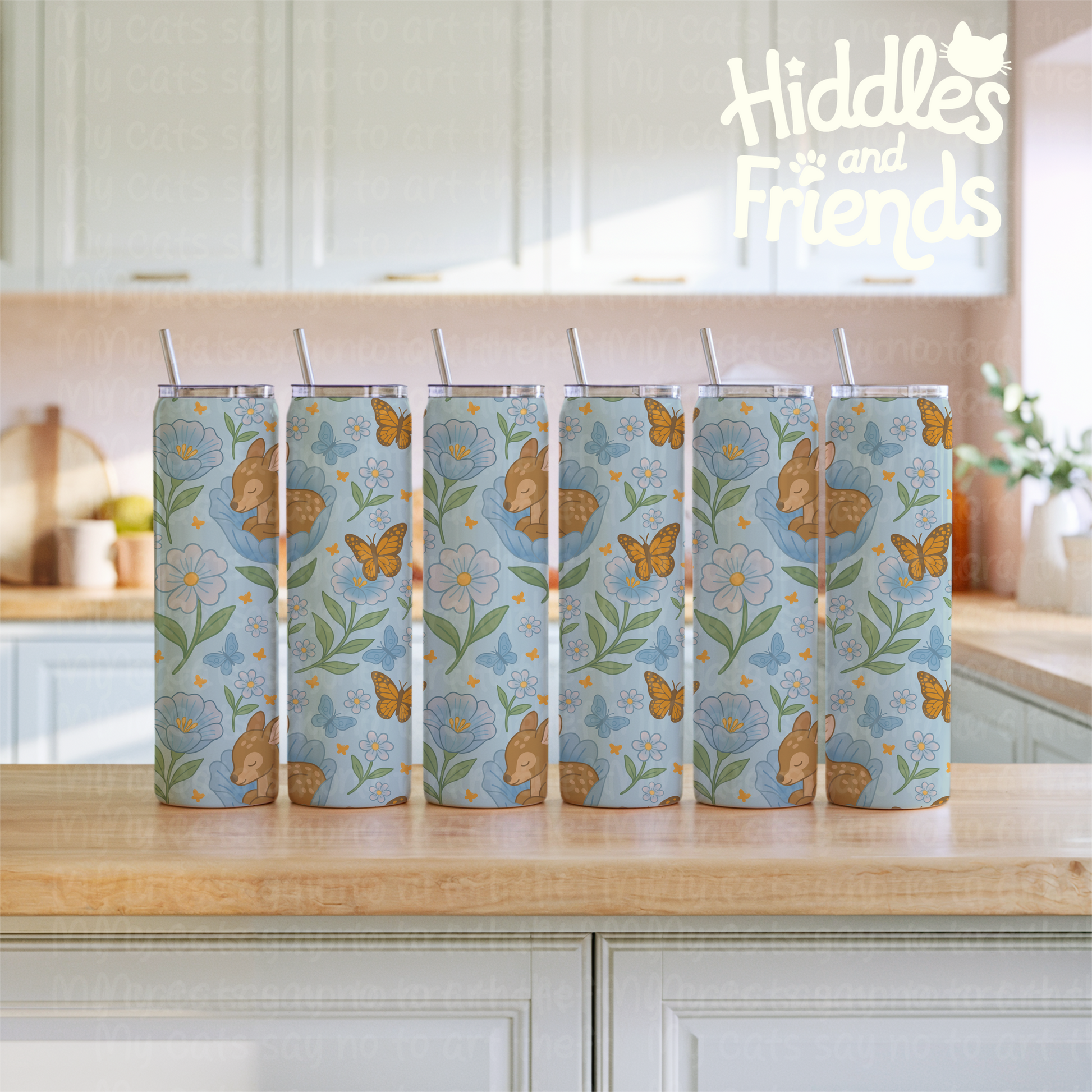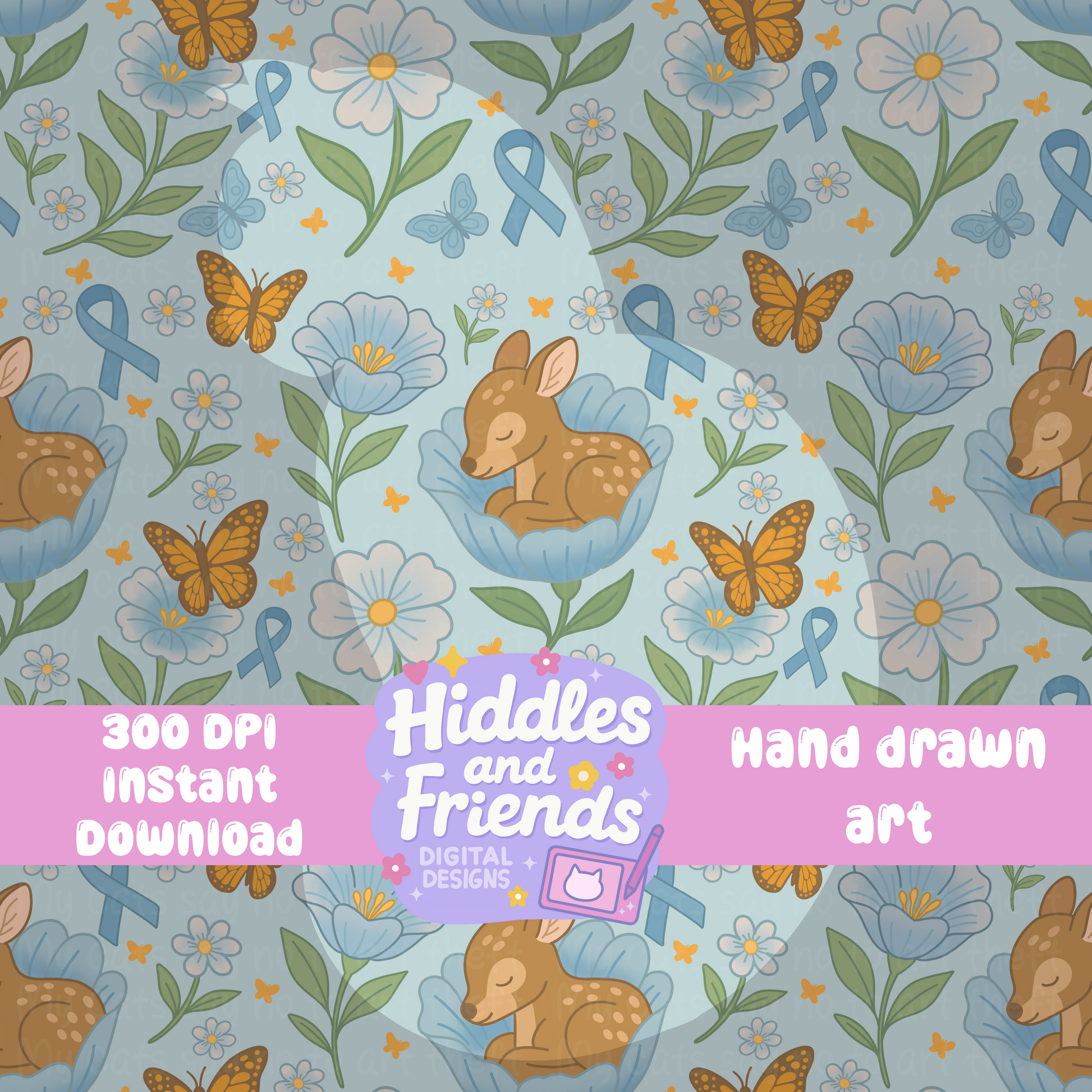 This collection includes three seamless digital files featuring a sleeping fawn nestled in soft blossoms, surrounded by butterflies, wildflowers, and calming spring colors. Two files include blue awareness ribbons to honor Human Trafficking Awareness, while one is a non-ribbon version perfect for general use by anyone who simply loves sweet woodland vibes.