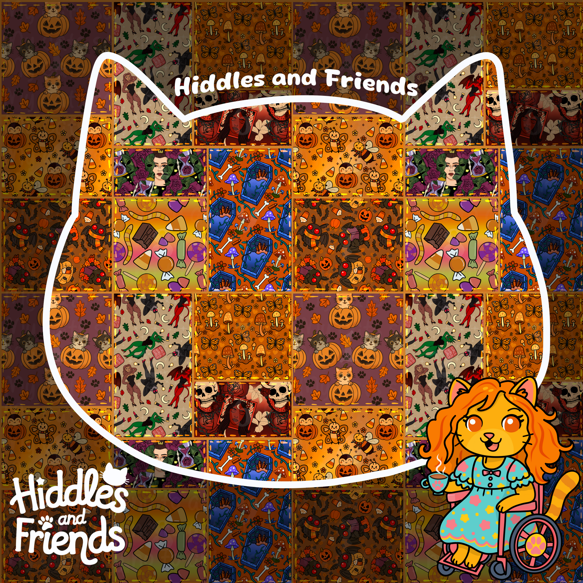 This seamless patchwork design combines all the best parts of spooky season — pumpkin cats, skeletons, devils, candy, bees, mushrooms, and more — in a cozy Halloween collage. With warm autumn tones and a playful mix of creepy and cute, it’s perfect for fabric, blankets, and seasonal crafts.
