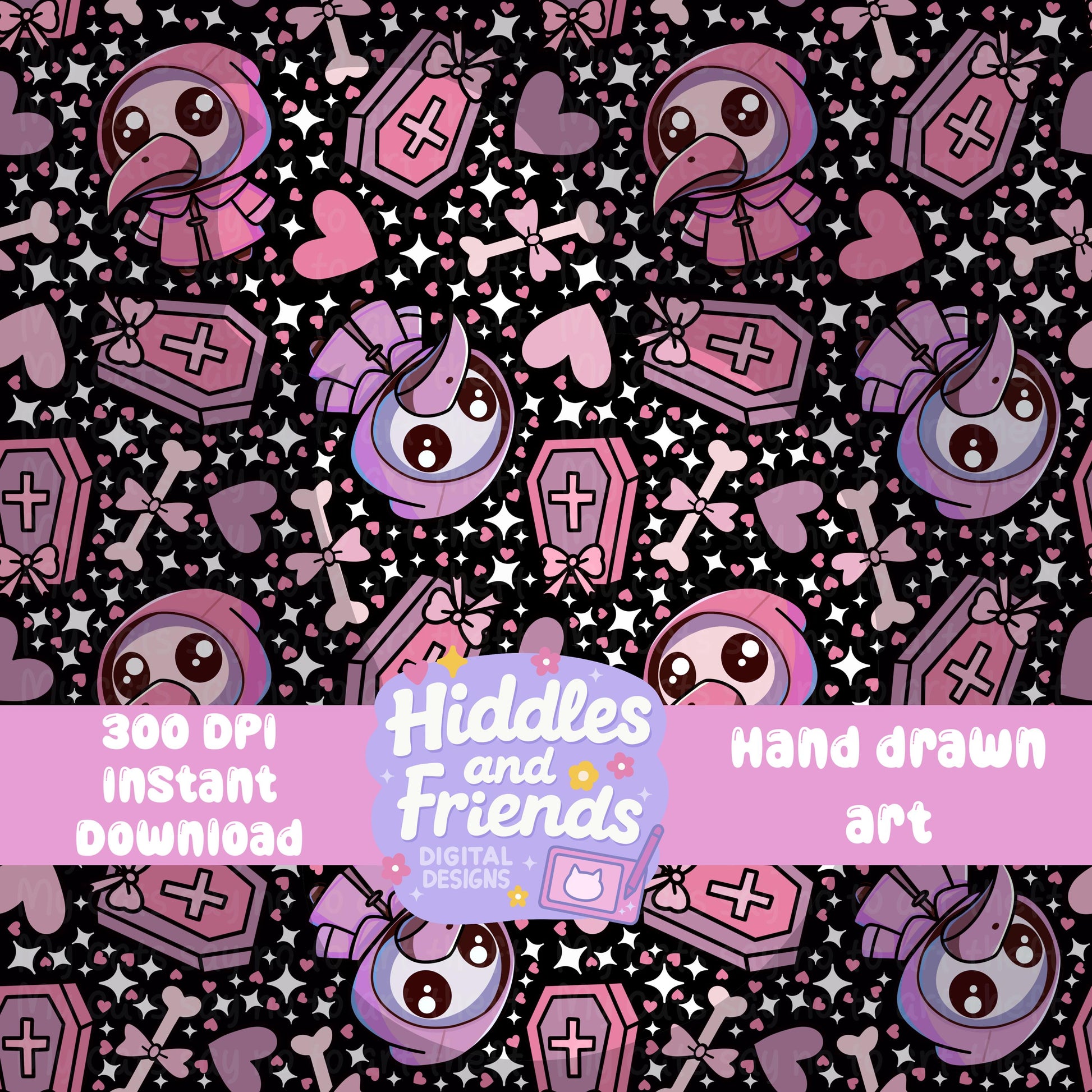 This high-quality seamless pattern features an adorable pink plague doctor with cutesy coffins, bones, and hearts. Perfect for gothic cute vibes and Valentine’s crafts! Great for scrapbooking, fabric printing, sublimation, and more.