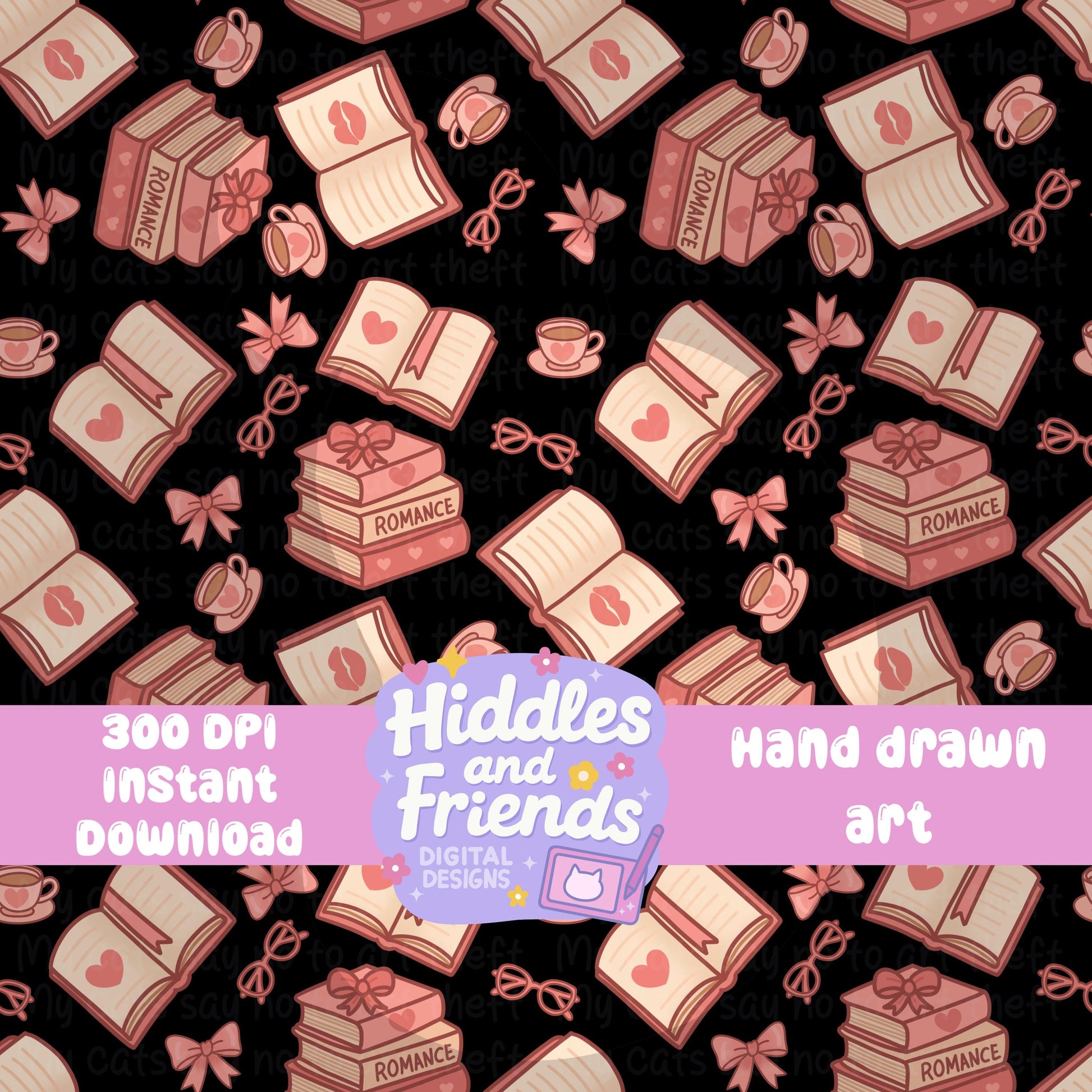 Romance Book Seamless Pattern – Bookish PNG with Hearts, Bows & Tea – Cute Pink Repeat Design – Instant Download Coquette Bookish Seamless