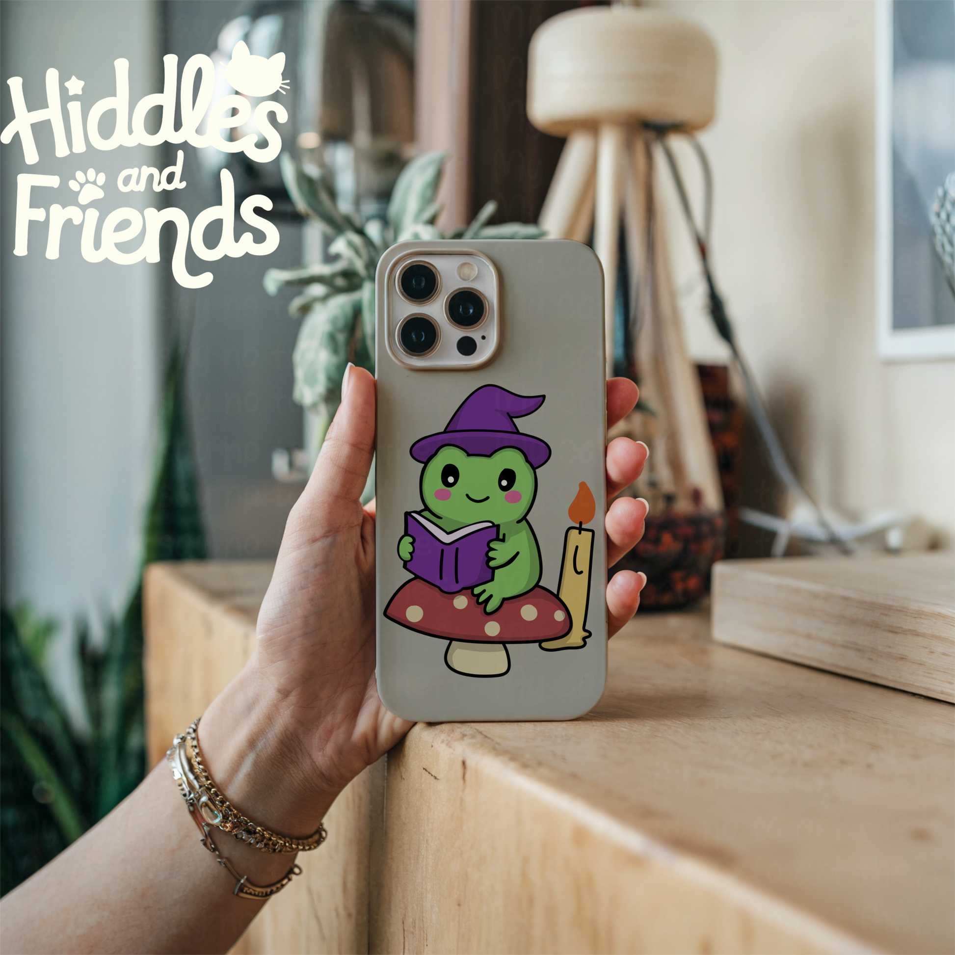 This high-quality PNG digital sticker features a charming frog in a purple wizard hat, reading a spell book on top of a mushroom next to a candle. Perfect for journaling, scrapbooking, digital planners, or crafts. Hand drawn with love and available as an instant download.